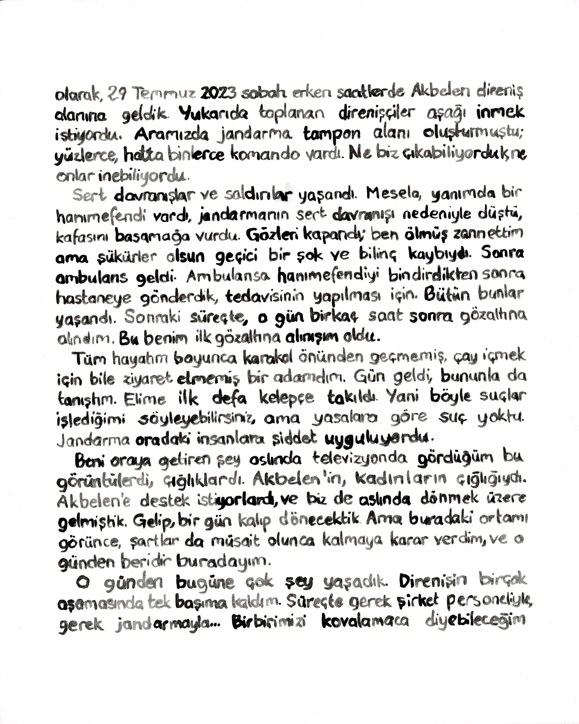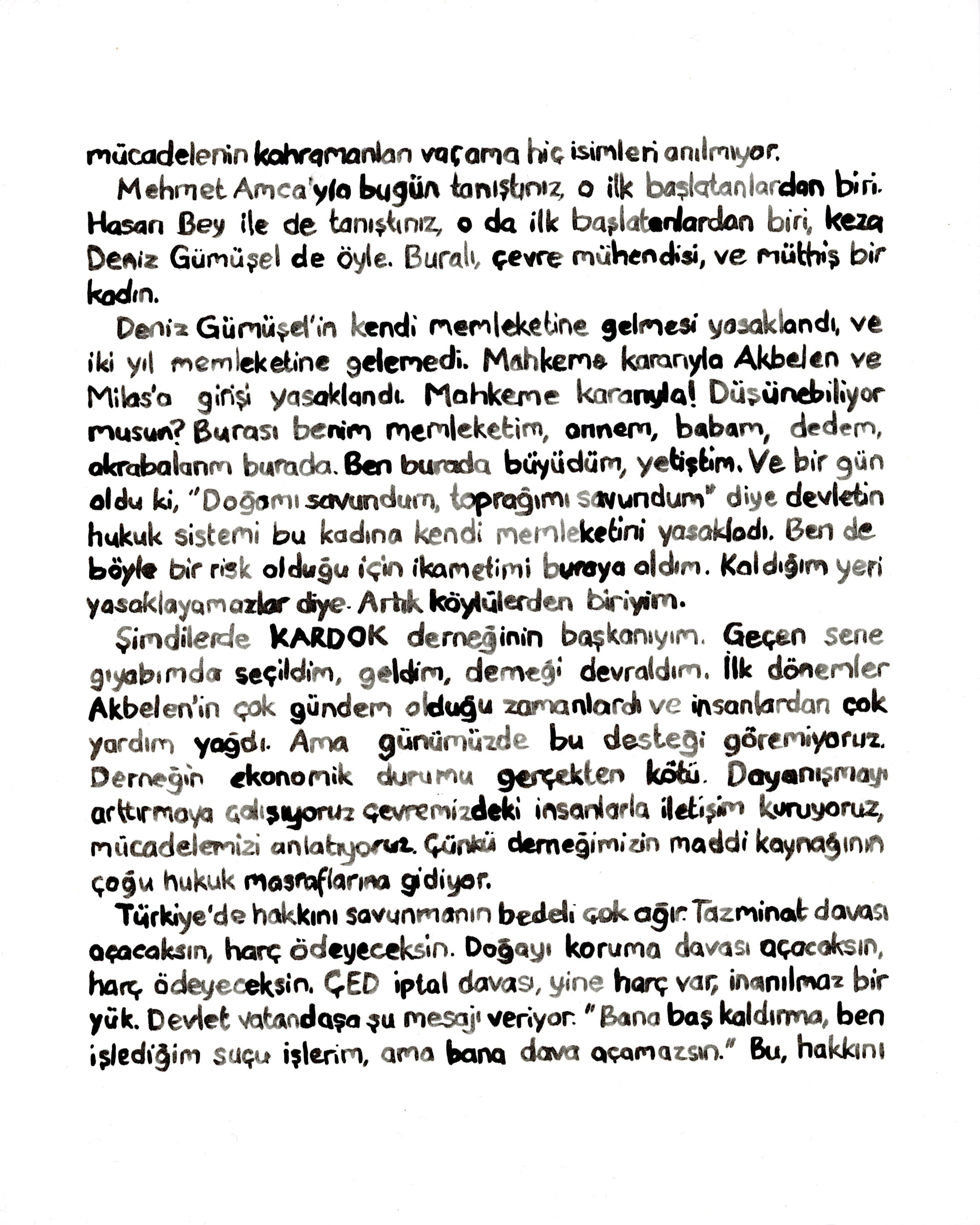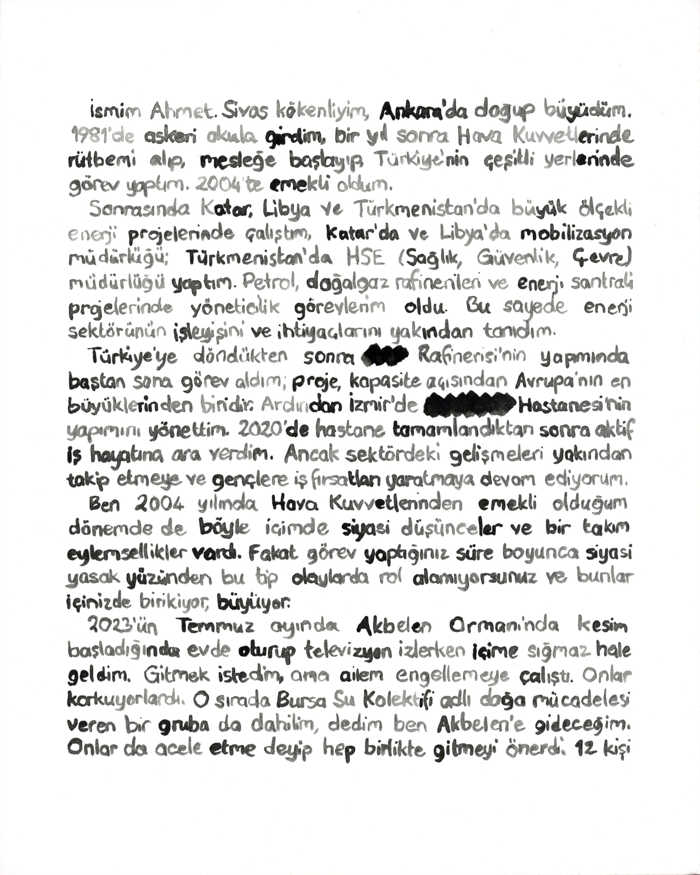Watercolor of the transcription of our interview with Ahmet, a former energy sector worker turned eco-activist. He first came to Akbelen to show solidarity with the locals and later moved into the village, remaining active in the solidarity movement.
