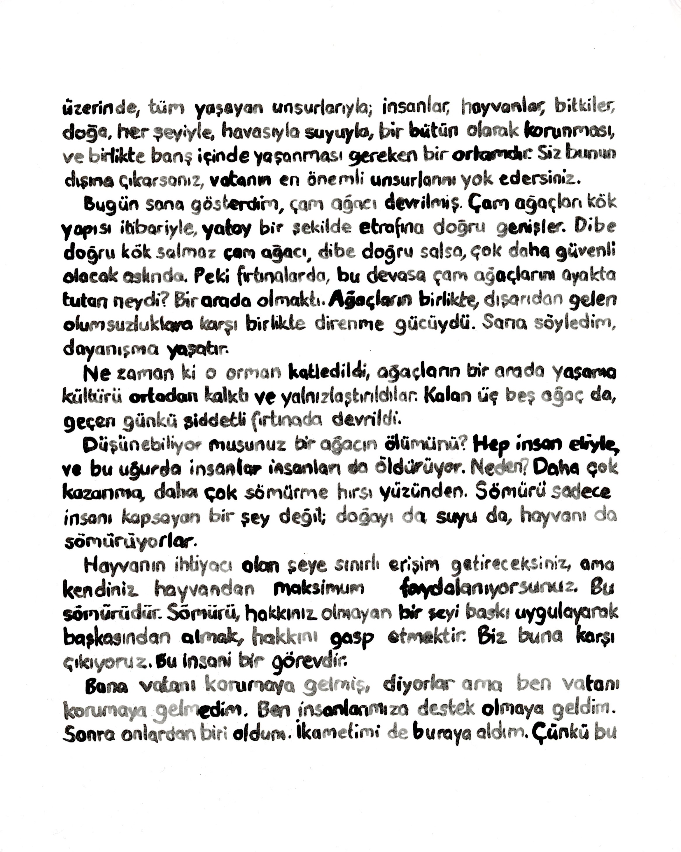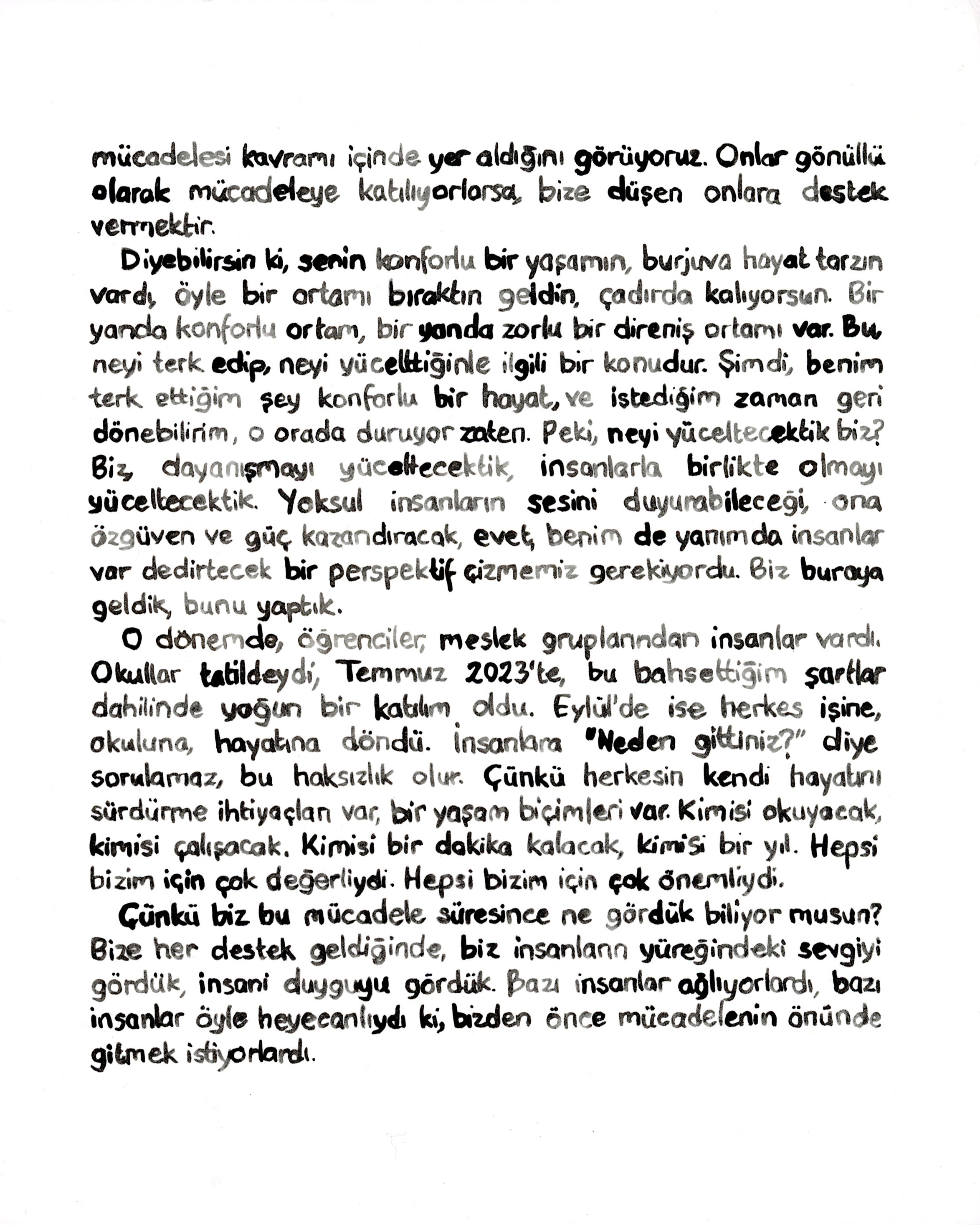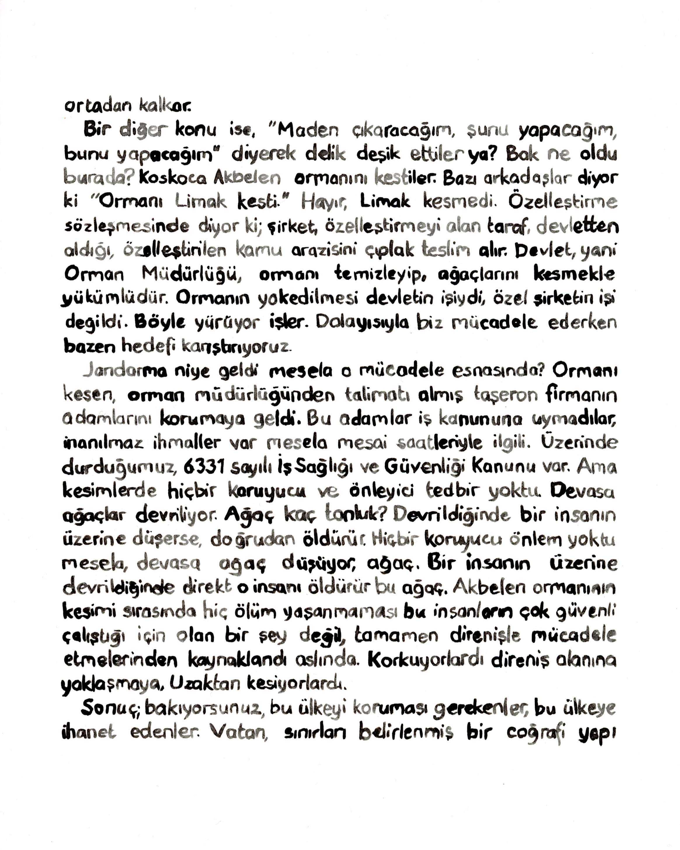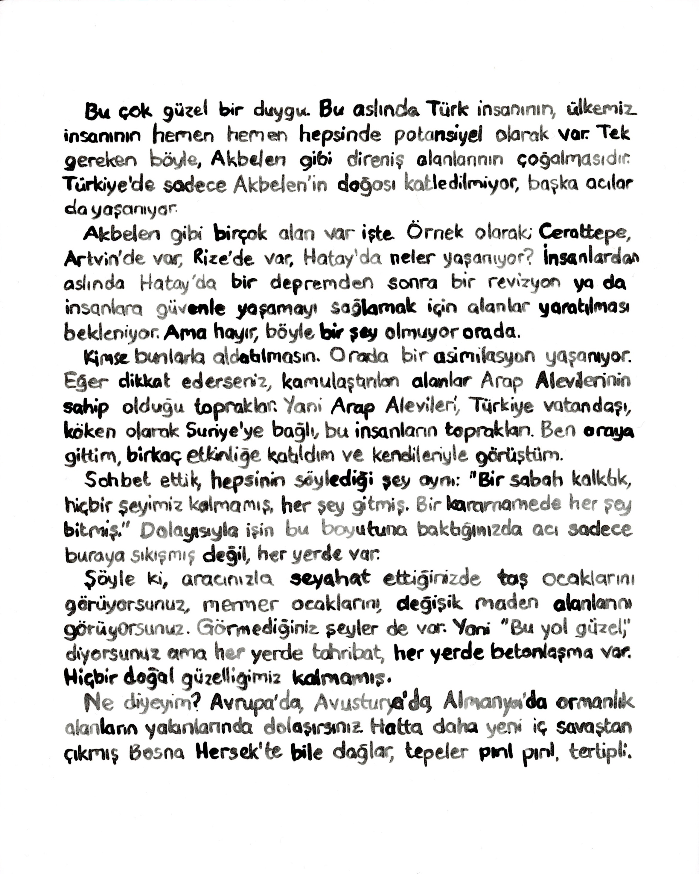 Watercolor of the transcription of our interview with Ahmet, a former energy sector worker turned eco-activist. He first came to Akbelen to show solidarity with the locals and later moved into the village, remaining active in the solidarity movement.