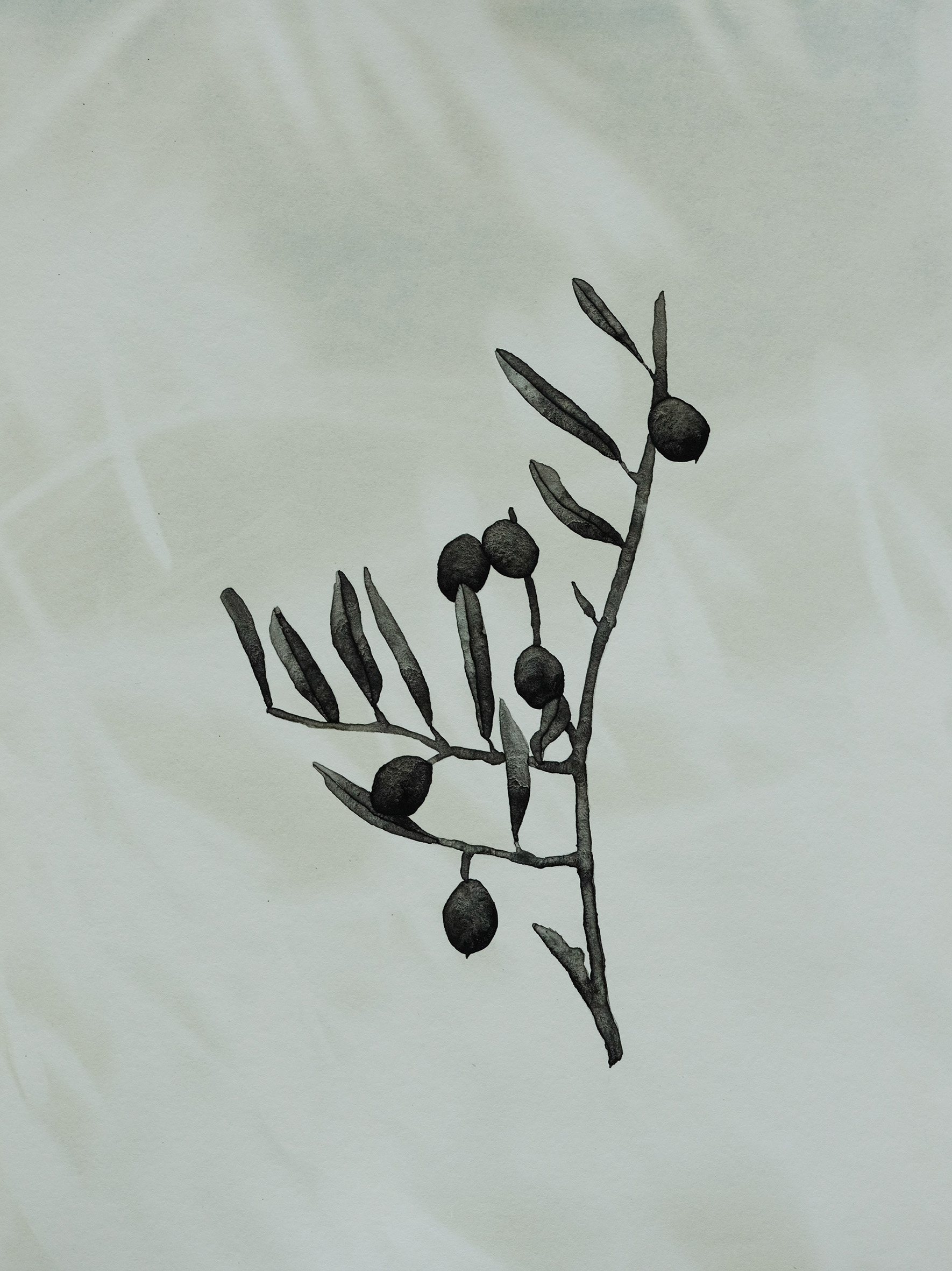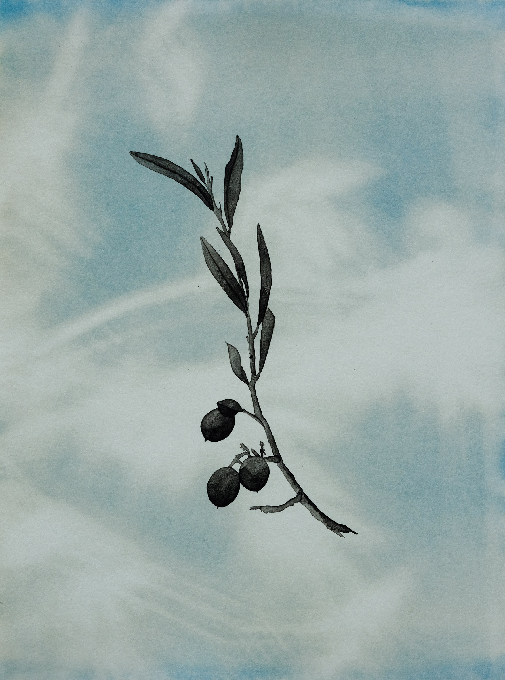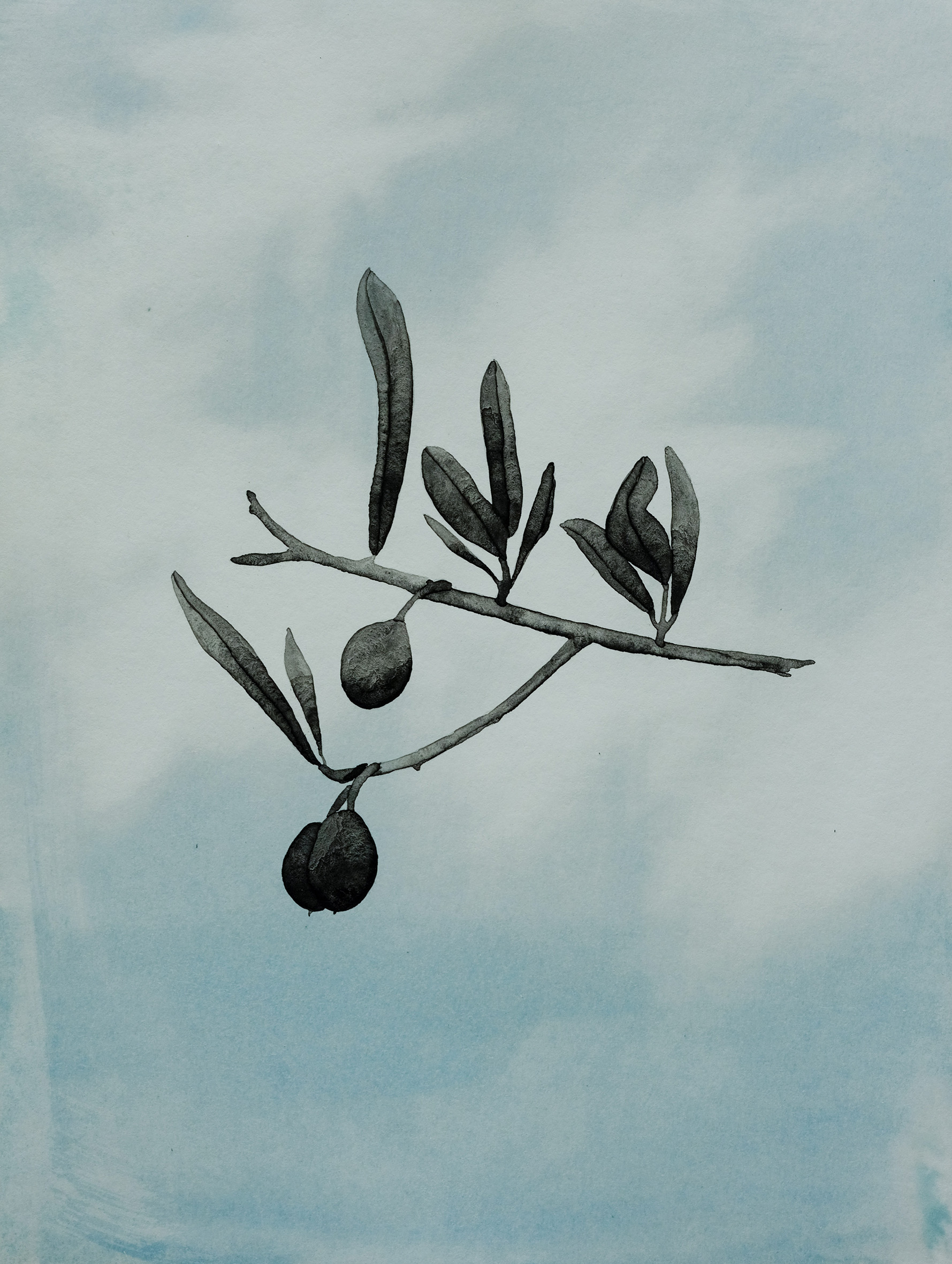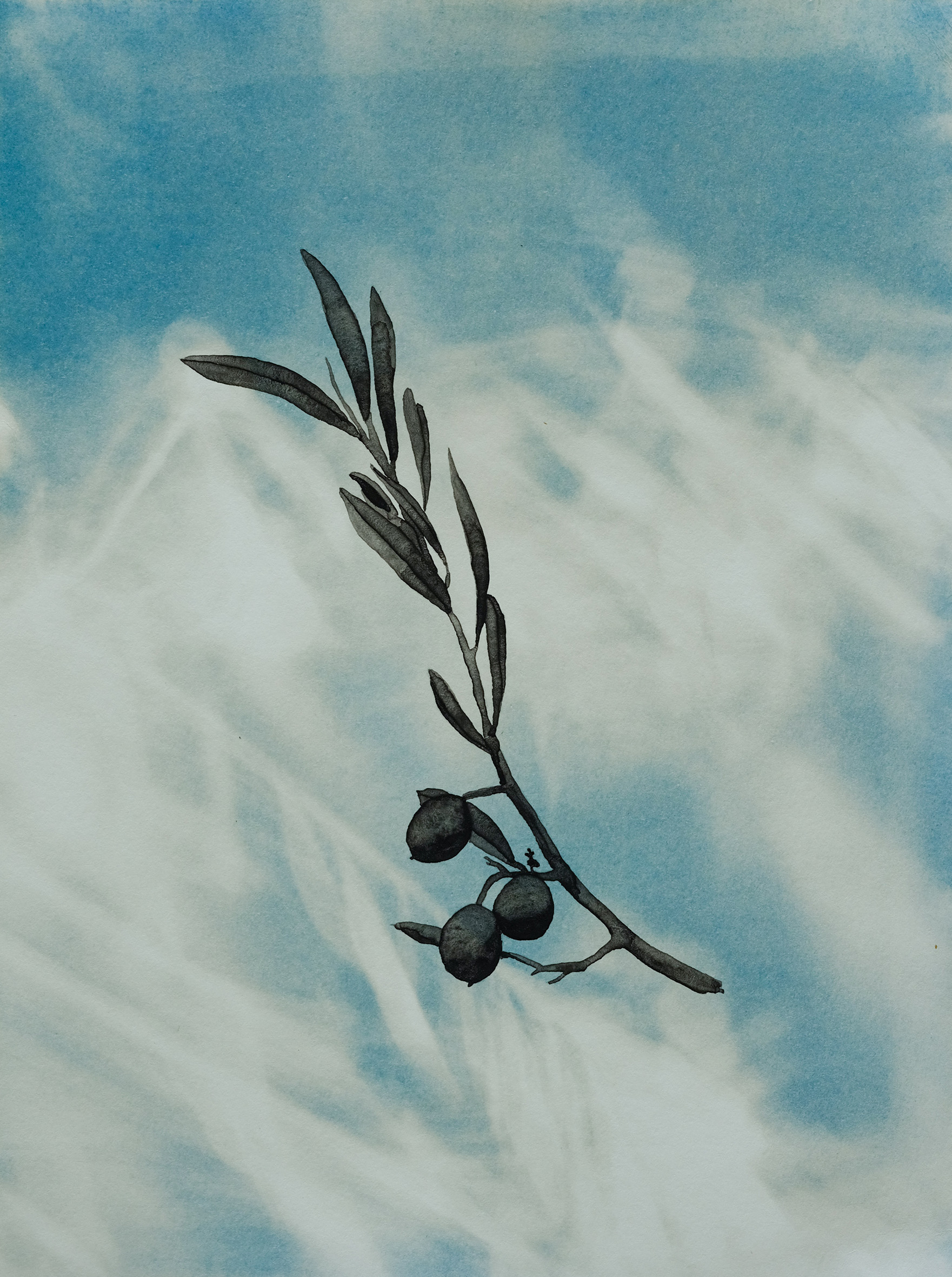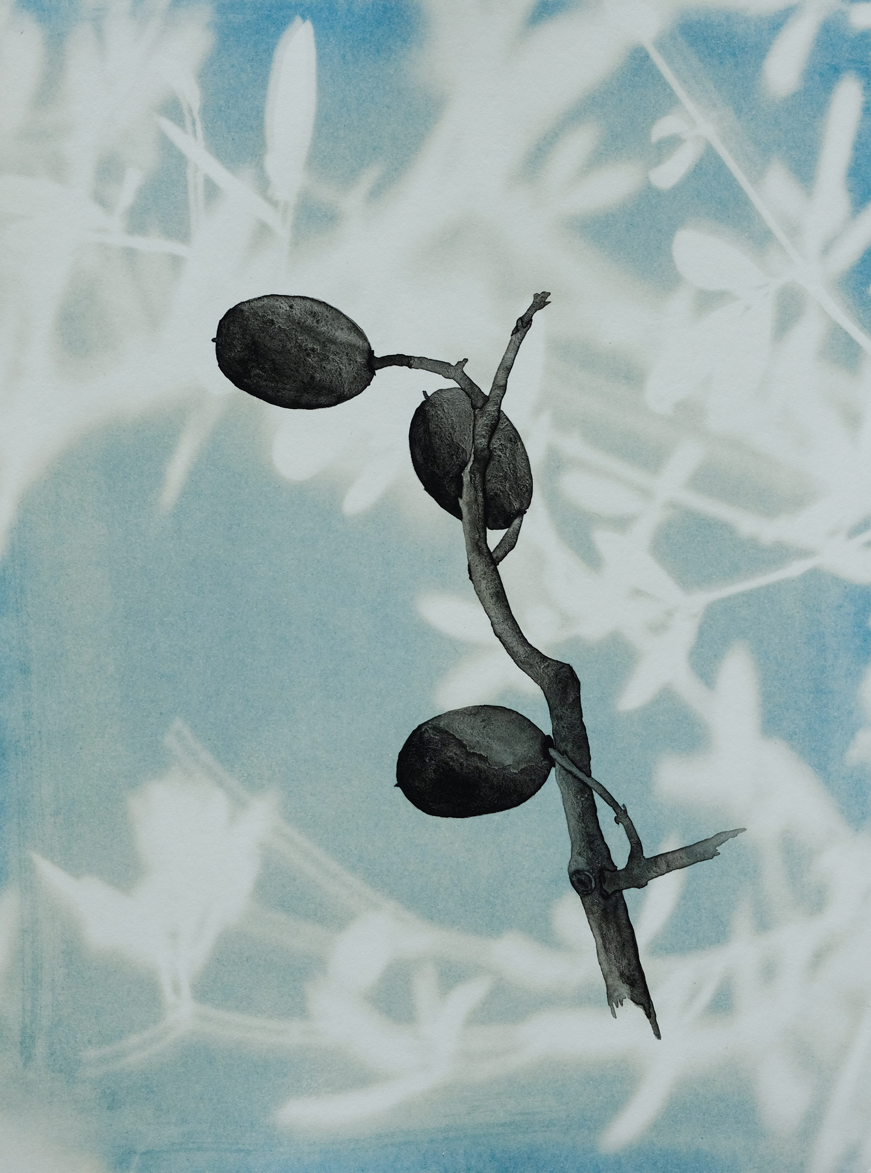 Charcoal and watercolor drawing on a cyanotype print of olive trees in Muğla, 2025.